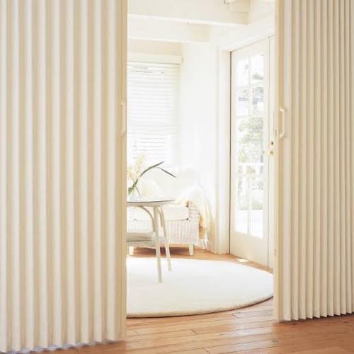 横方向に伸縮できる蛇腹または折りたたみ式の間仕切りです。生地は塩化ビニールが一般的ですが、スケルトン生地やファブリック生地など様々な素材のものがあります。
